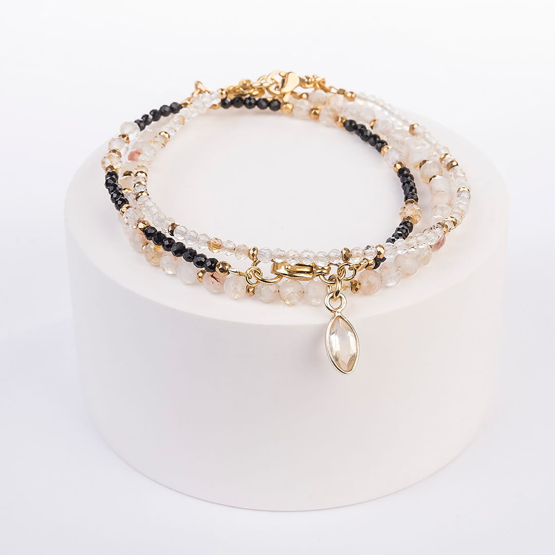 Bransoletka wykonana jest z drobnych kamieni wielkości ok. 2,2 oraz 3 mm. Możesz bez żadnych przeszkód zapinać i rozpinać zapięcie z nierdzewnej stali w złotym kolorze. Całość wykonana została pieczołowicie na profesjonalnej lince jubilerskiej.