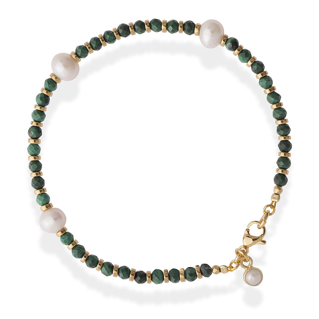 Głęboka butelkowa zieleń malachitu przełamana złotym hematytem i perłową bielą to oryginalny dodatek do Twojej stylizacji. Klasyczna bransoletka w nowoczesnym wydaniu, dla wszystkich kobiet, które lubią kolor zielony. Ta bransoletka to idealny prezent dla mamy, babci czy siostry. Bransoletka z malachitów stanowi piękny komplet z naszyjnikiem z malachitów i pereł.