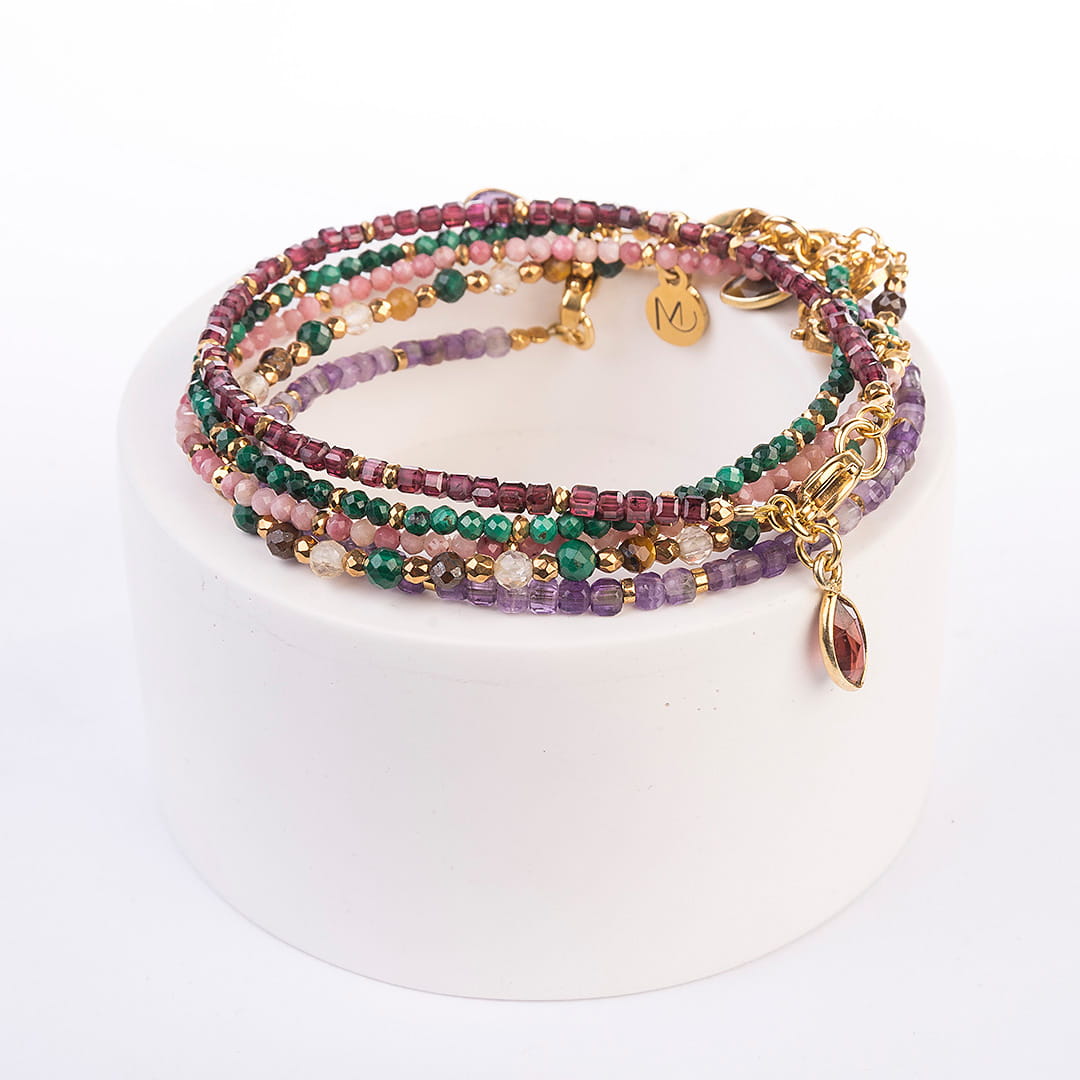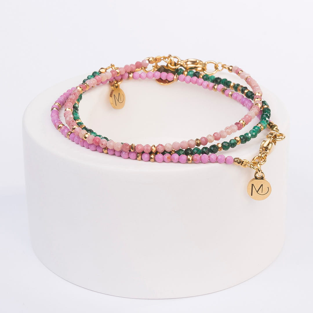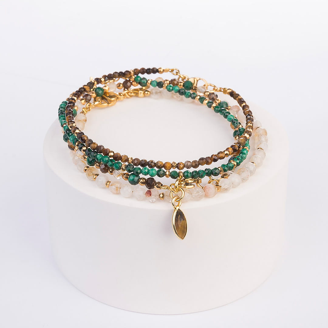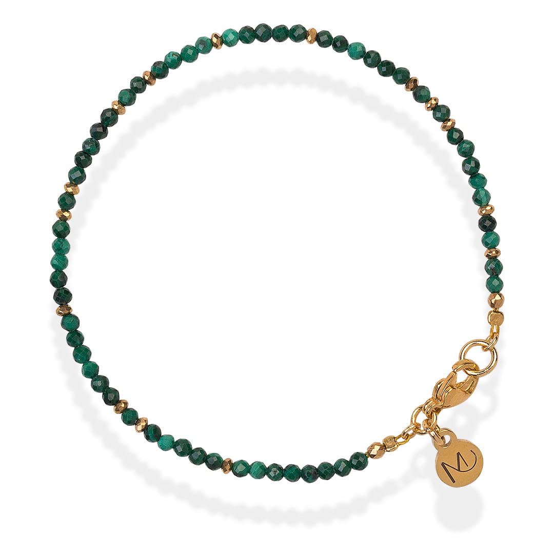 Bransoletka z subtelnych kamieni malachitu przekładanych hematytem w złotym kolorze. Doskonale się prezentuje na ręku w kompozycji z innymi zmysłowymi bransoletkami od Mikaena.