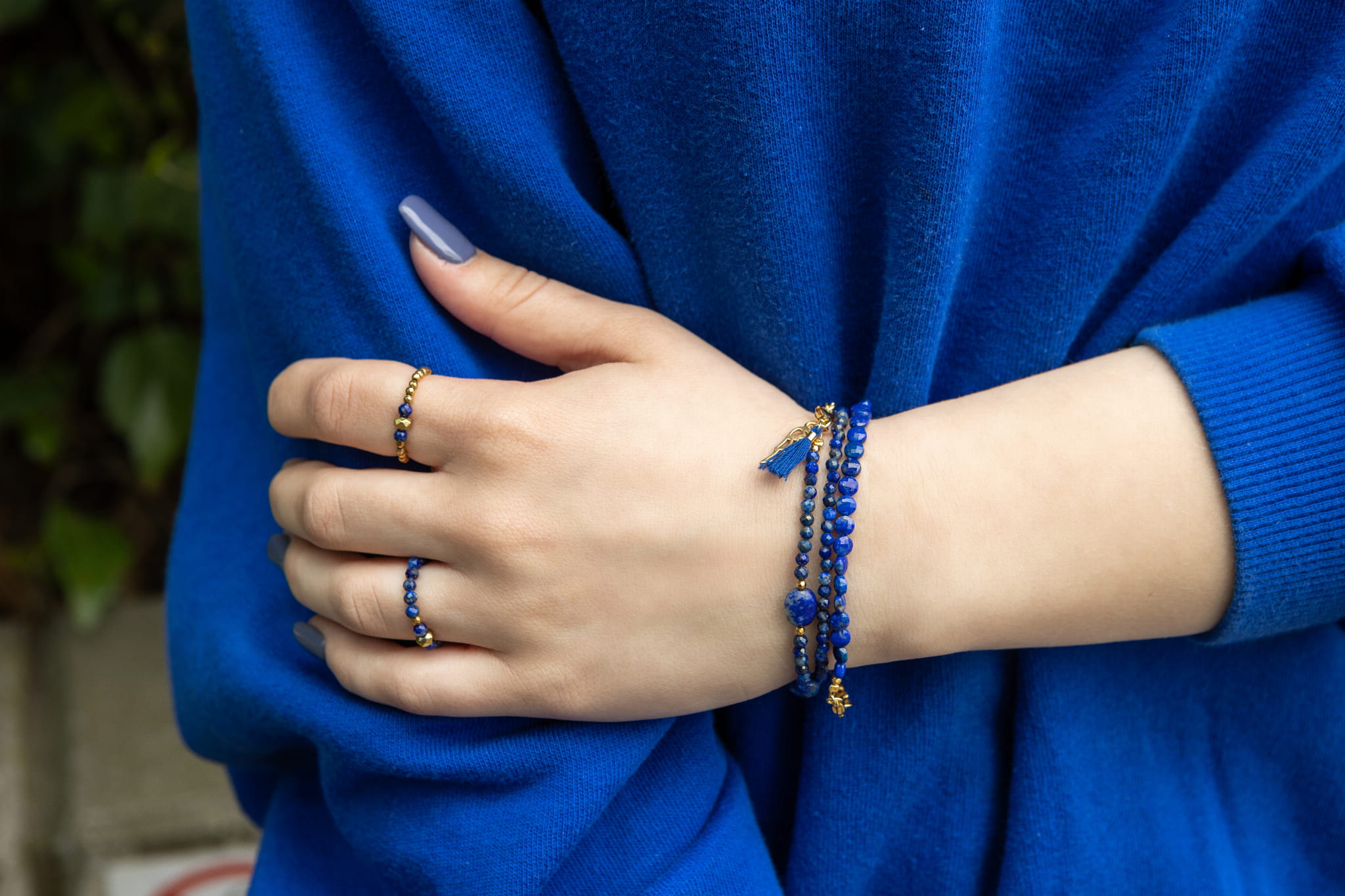 Bransoletka z płaskich kamieni lapis lazuli. Oryginalny kształt kamieni przełamuje powagę lapis lazuli i sprawia, że ta bransoletka jest świetnym dodatkiem także do wakacyjnych i casualowych stylizacji. Idealnie pasuje do bransoletki z monetek z amazonitu oraz pierścionka z monetek z turkusem.