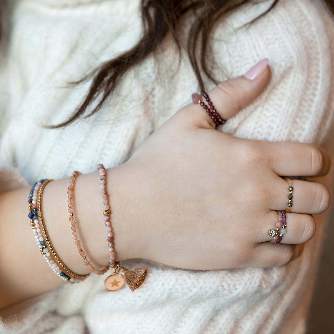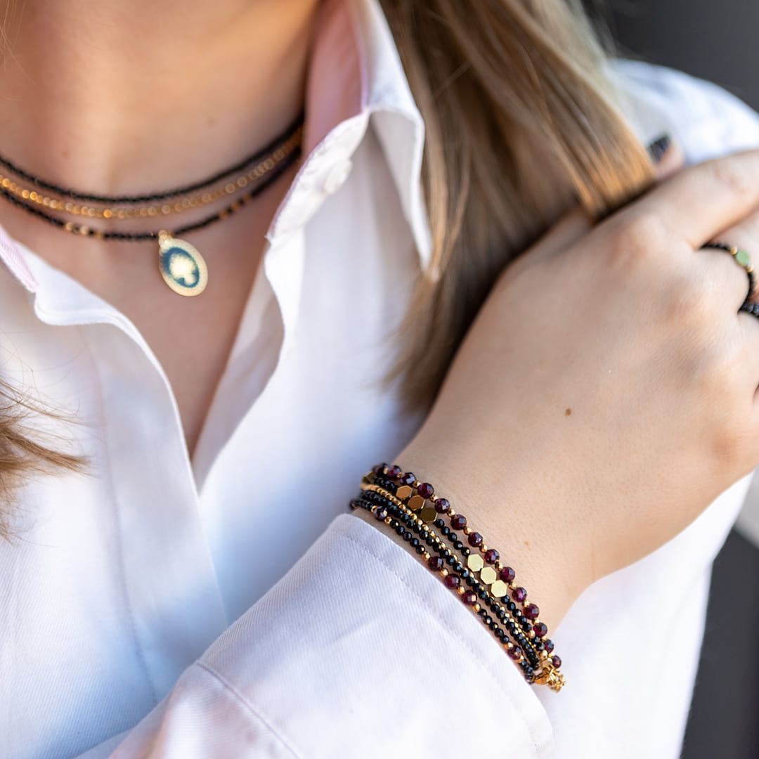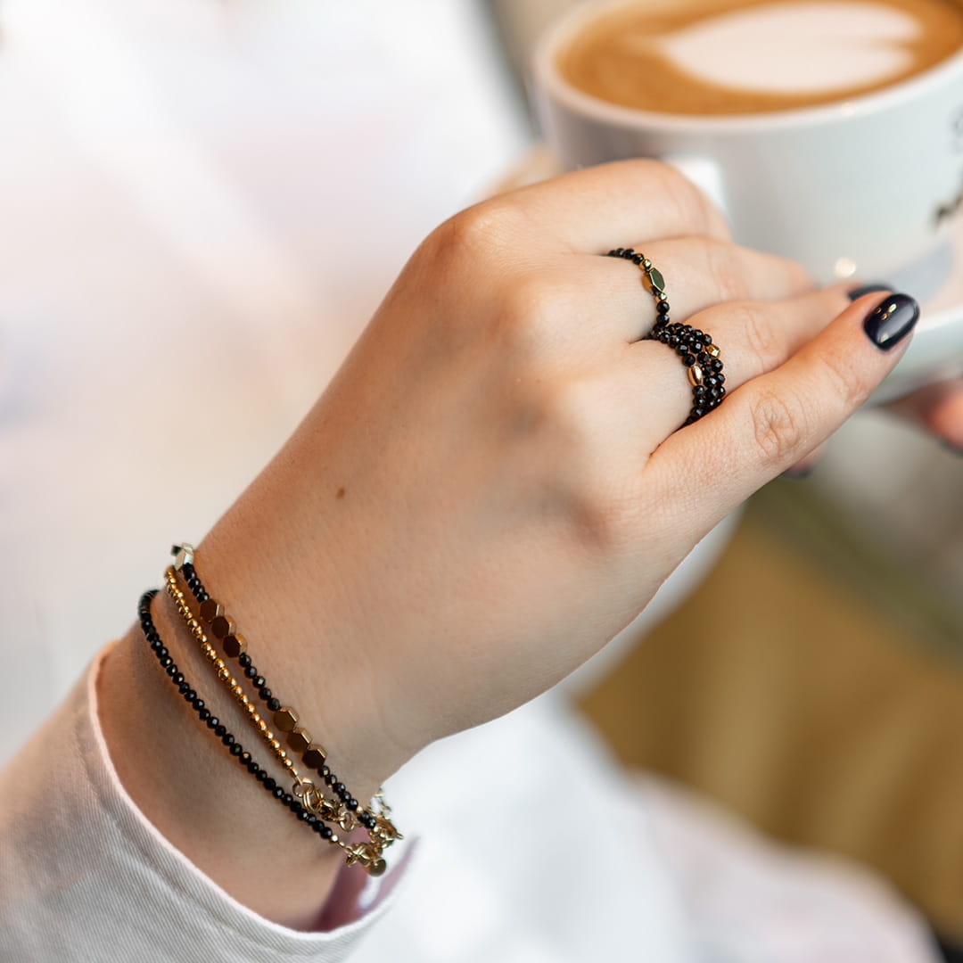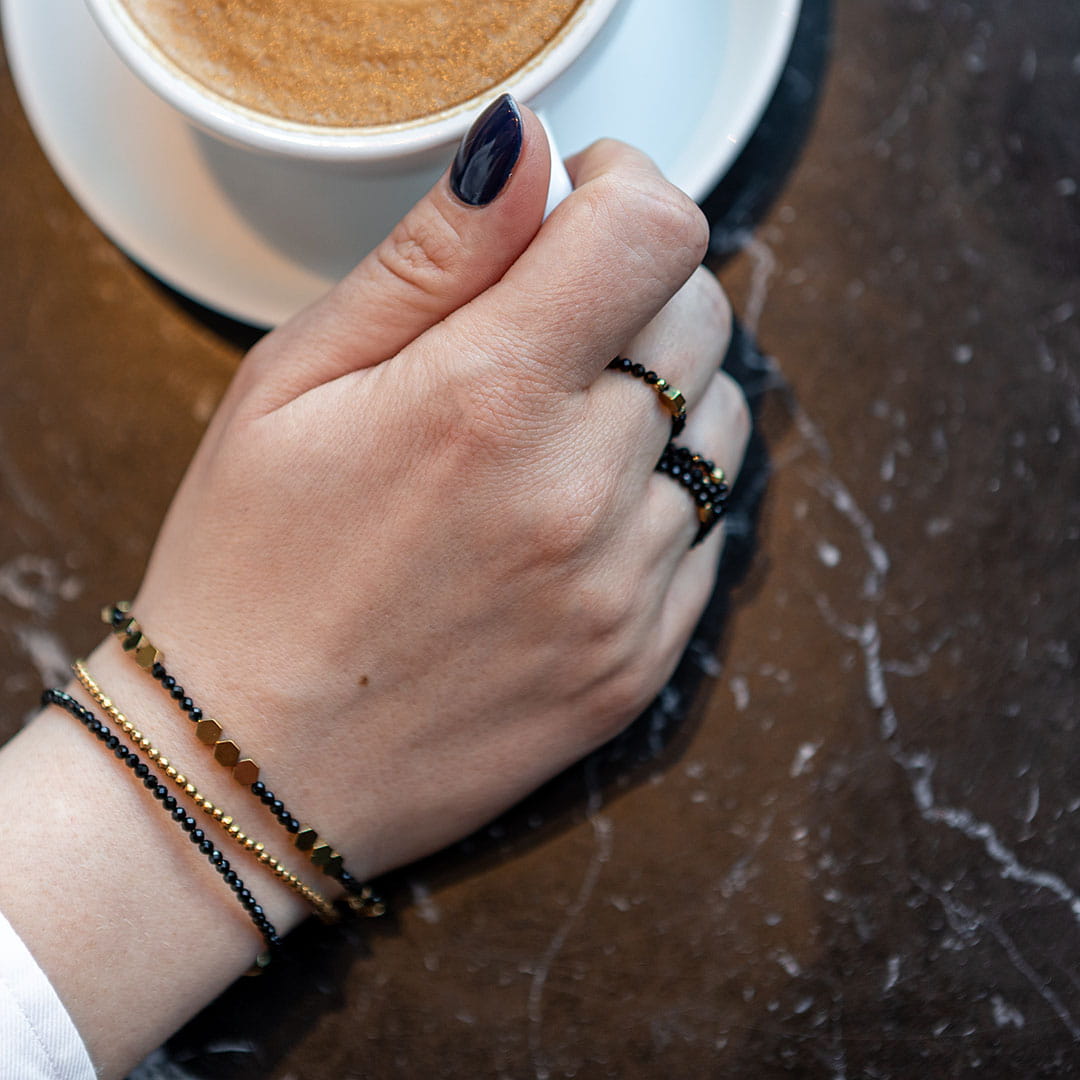 Klasyczna bransoletka z kamieni naturalnych w kolorze złotym. Idealna do noszenia samodzielnie lub jako baza do tworzenia wielokolorowych stylizacji. Pasuje do każdej bransoletki ze złotymi dodatkami! Twoje must-have biżuteryjne!