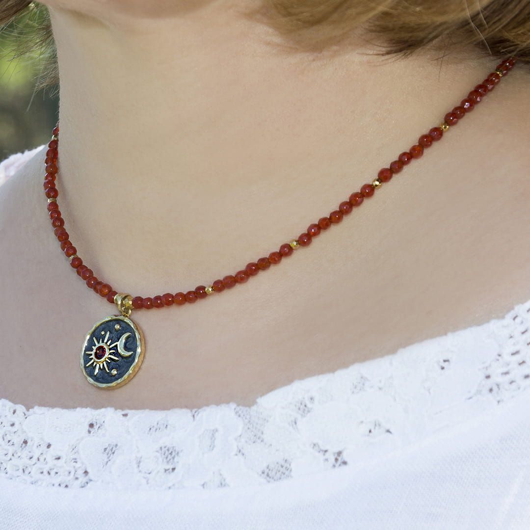 Choker Classic onyks czerwony z zawieszką słońce i księżyc