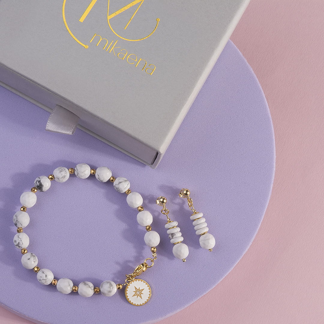 Zestaw biżuterii z białych kamieni naturalnych - bransoletka i pozłacane kolczyki - to letni must-have każdej fashionistki.