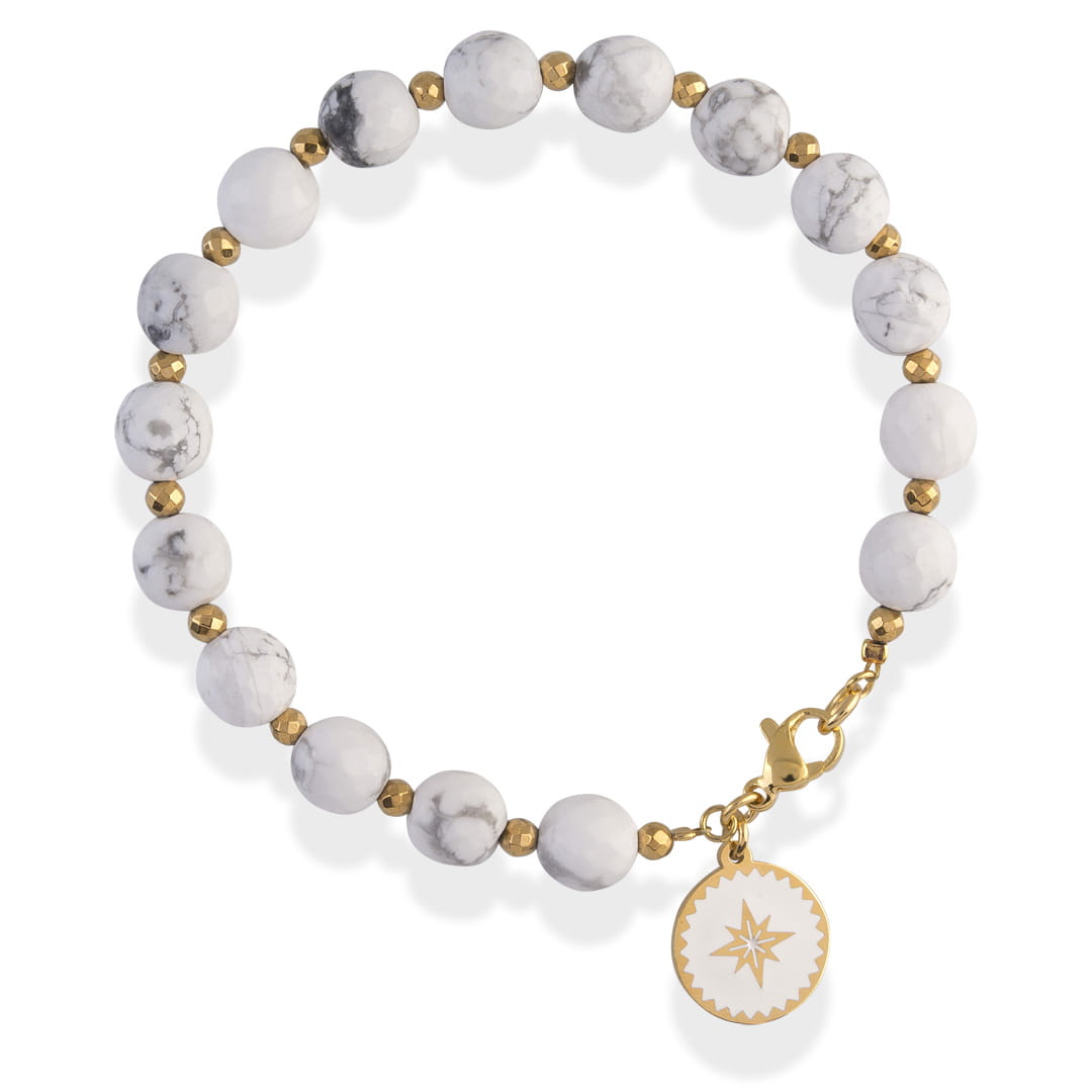 Taniej w zestawie!Letnia bransoletka z białych kamieni howlitu ze złotymi dodatkami podkręci Twoją stylizację, dodając jej wykwintnego charakteru.