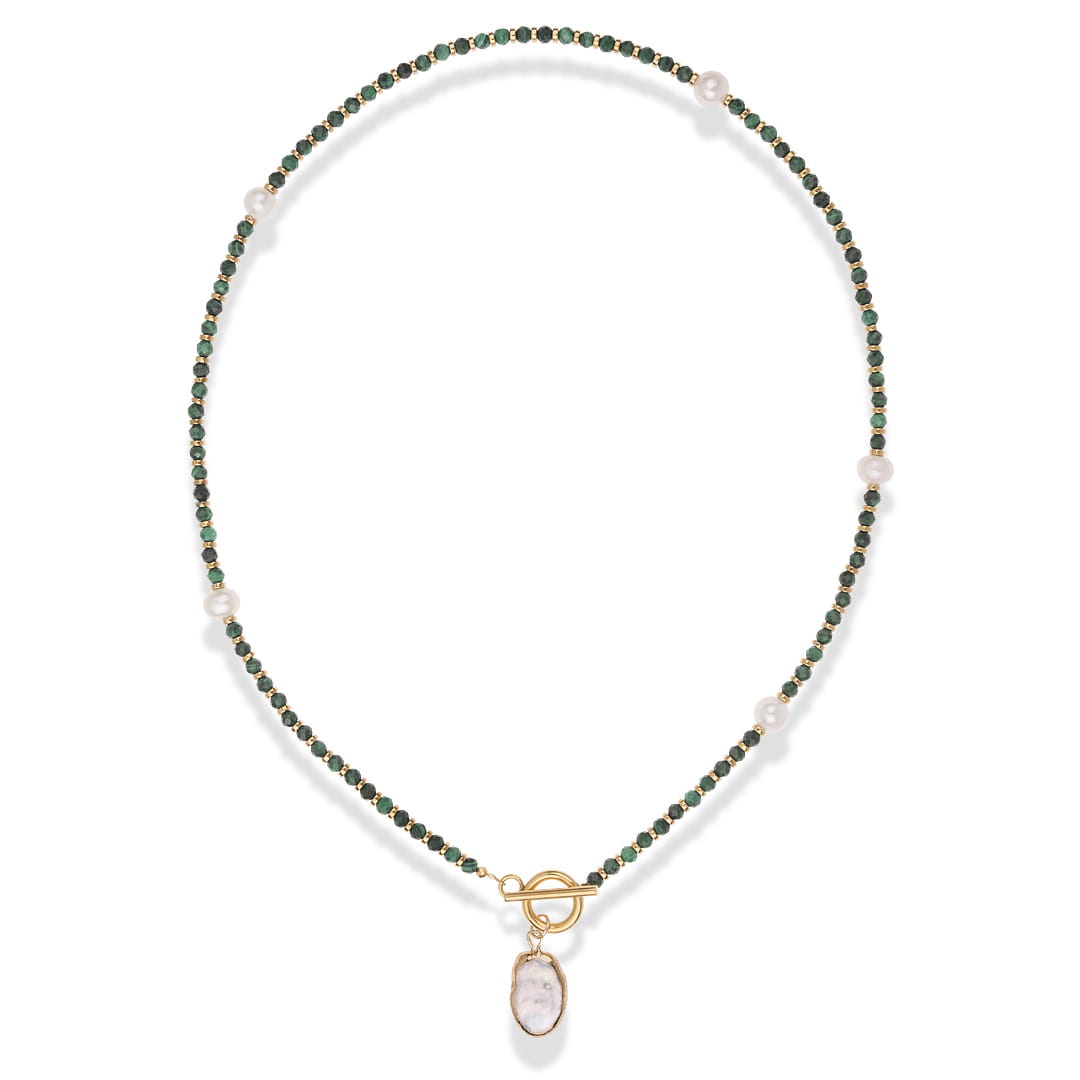 Naszyjnik równowagi i spokoju z zielonych kamieni malachitu pozytywnie wpłynie na równowagę emocjonalną, dodatkowo perła doda Ci kobiecej energii.