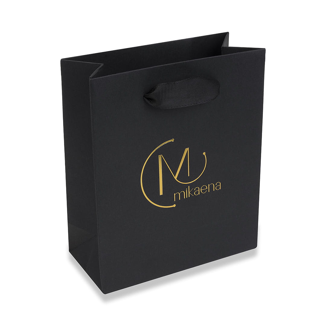 Elegancka, czarna torebka na biżuterię z czarnymi tasiemkami i złotym nadrukiem logo Mikaena. Idealna do zapakowania biżuterii na prezent - bransoletki, naszyjnika czy kolczyków.
